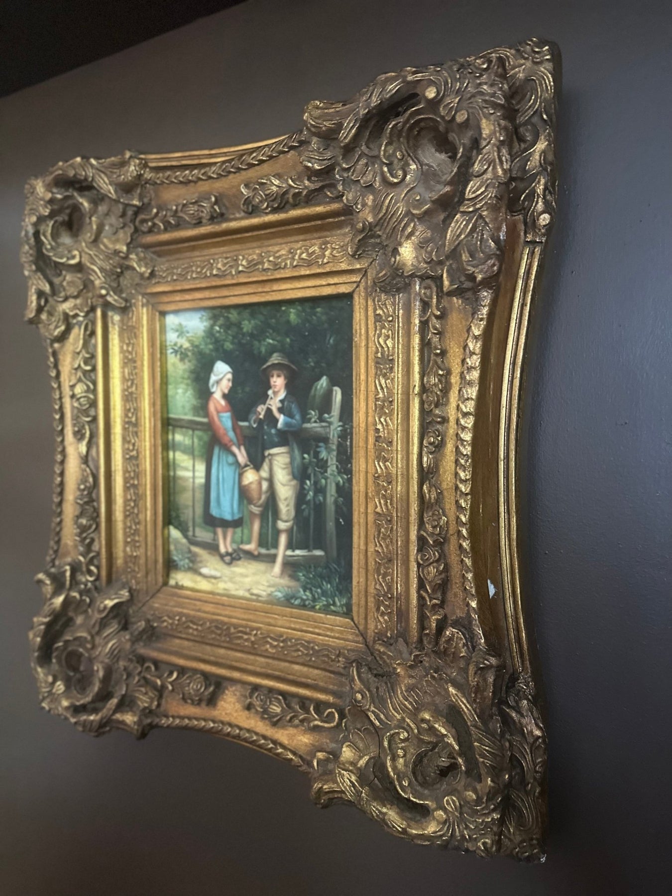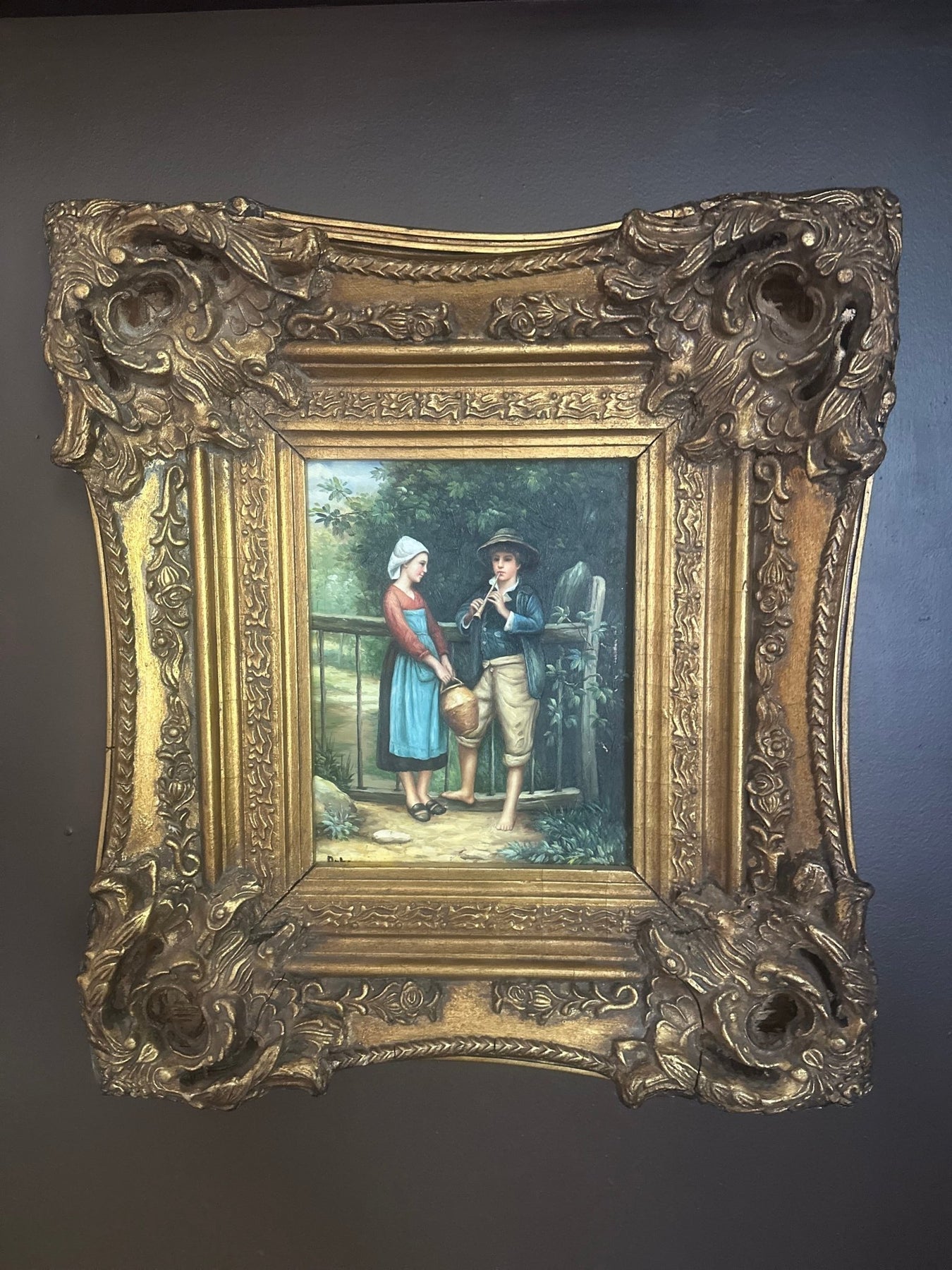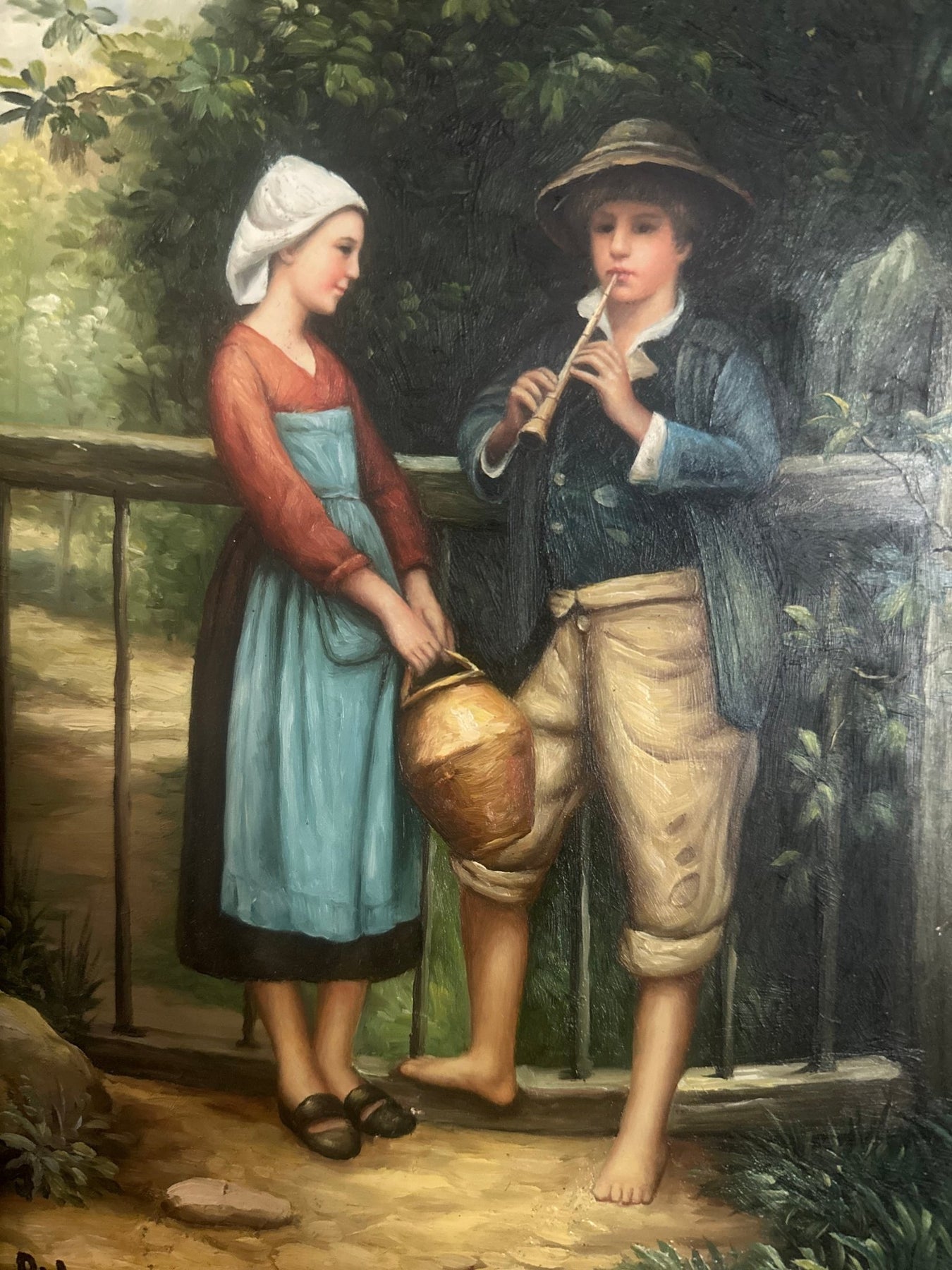 A charming 19th-century French pastoral oil painting depicting a barefoot shepherd boy serenading a young milkmaid, set within an exquisitely detailed Rococo gilt frame. The composition captures the tender simplicity of rural life, echoing the sentimental realism popular in France during the mid-to-late 1800s.