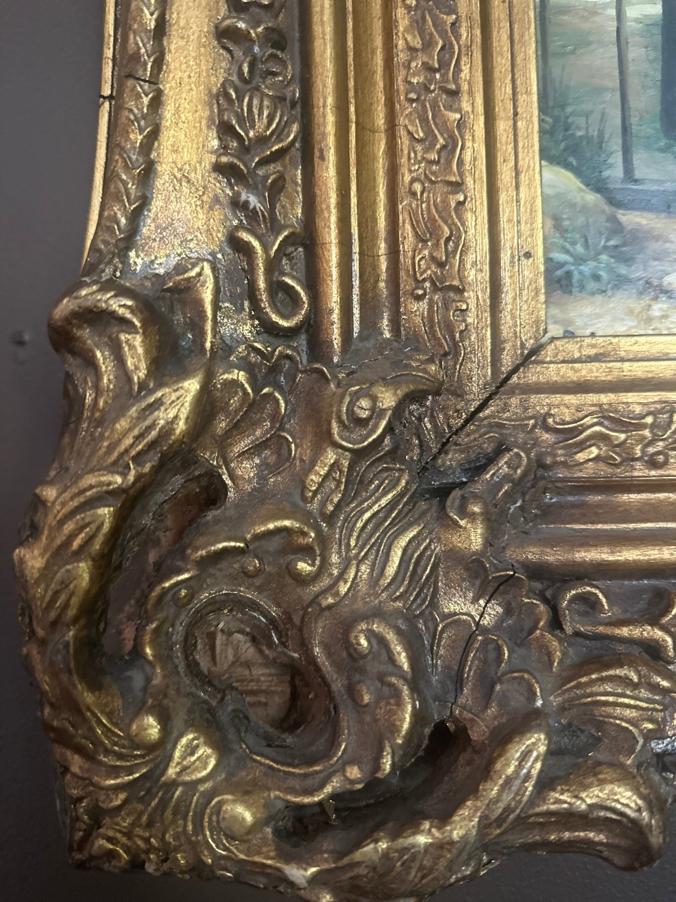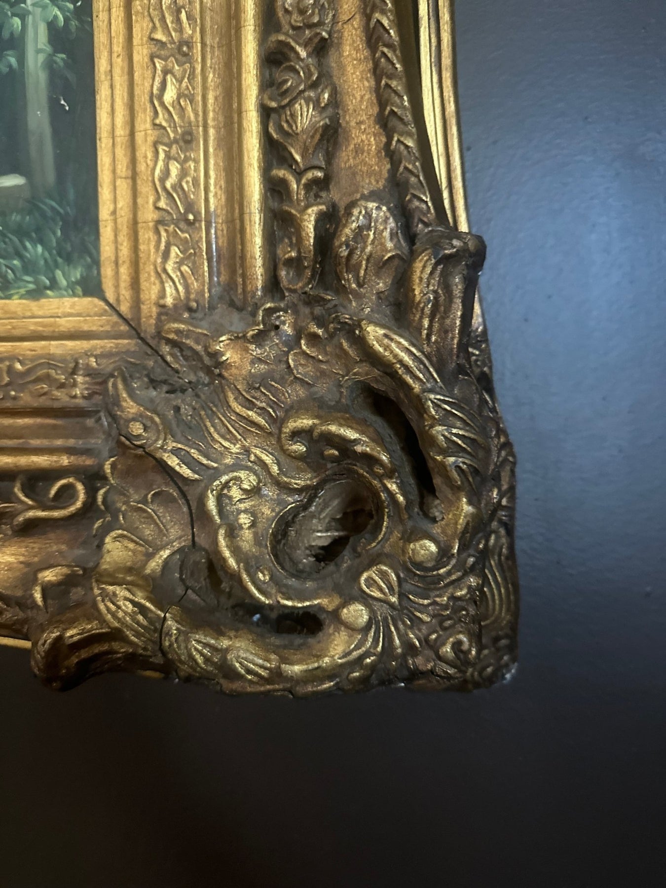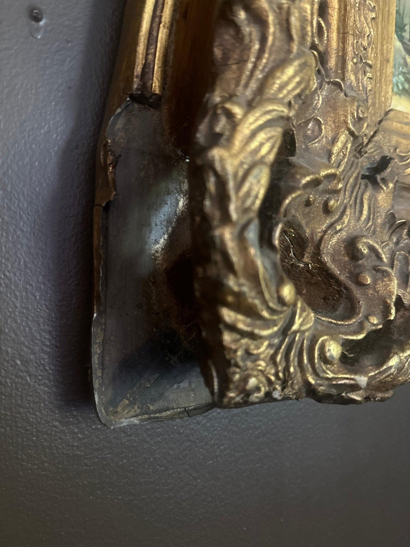 The hand-carved and gilded frame—with acanthus scrolls, floral flourishes, and dramatic corner reliefs—complements the intimacy of the scene. Areas of age-related wear and craquelure on the frame and surface testify to its authenticity and history.