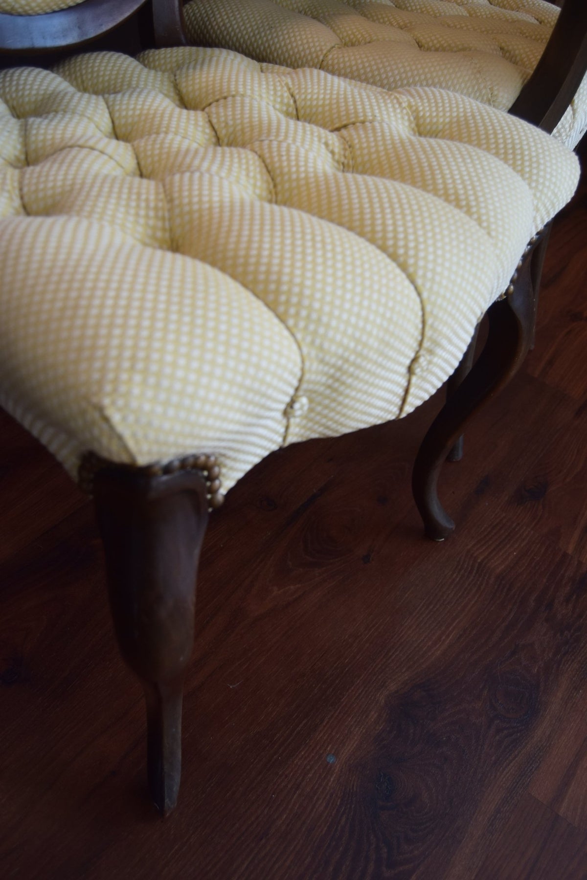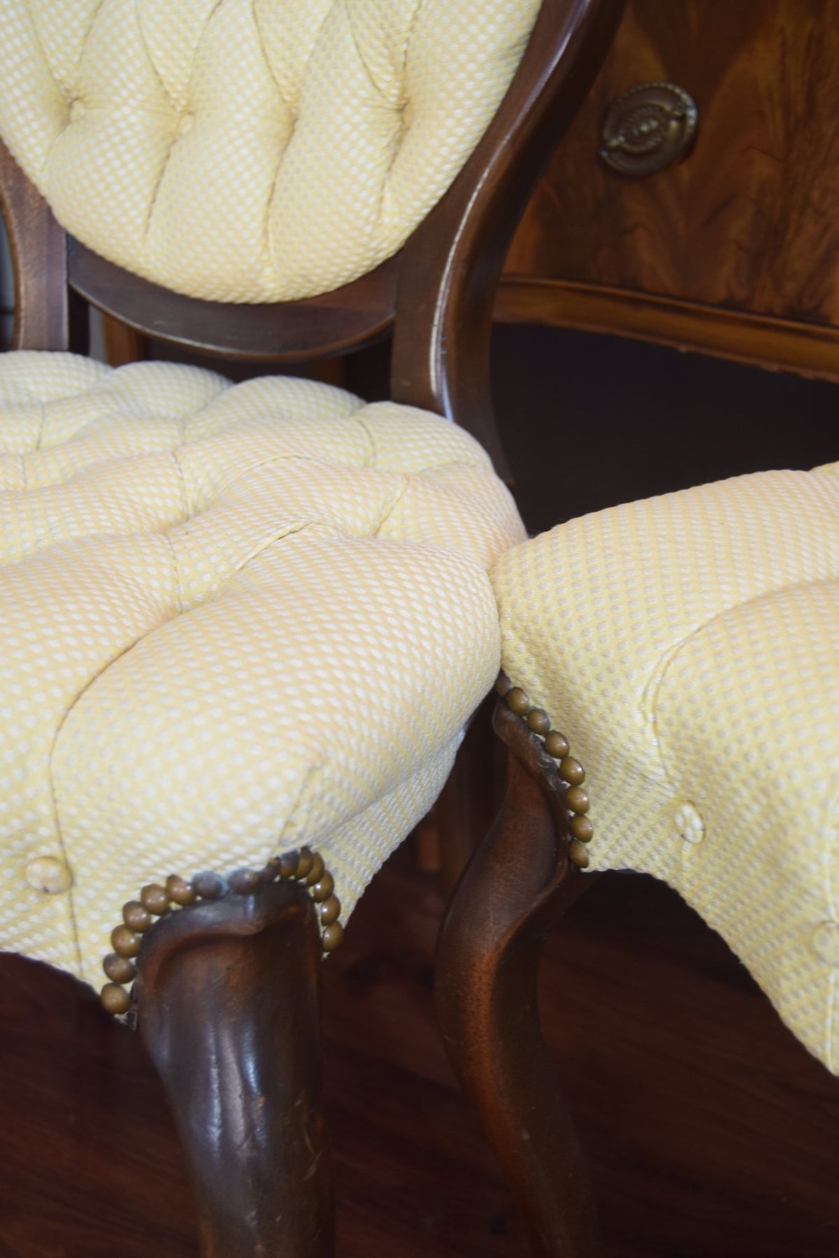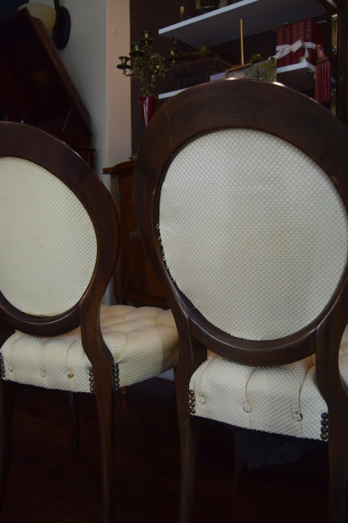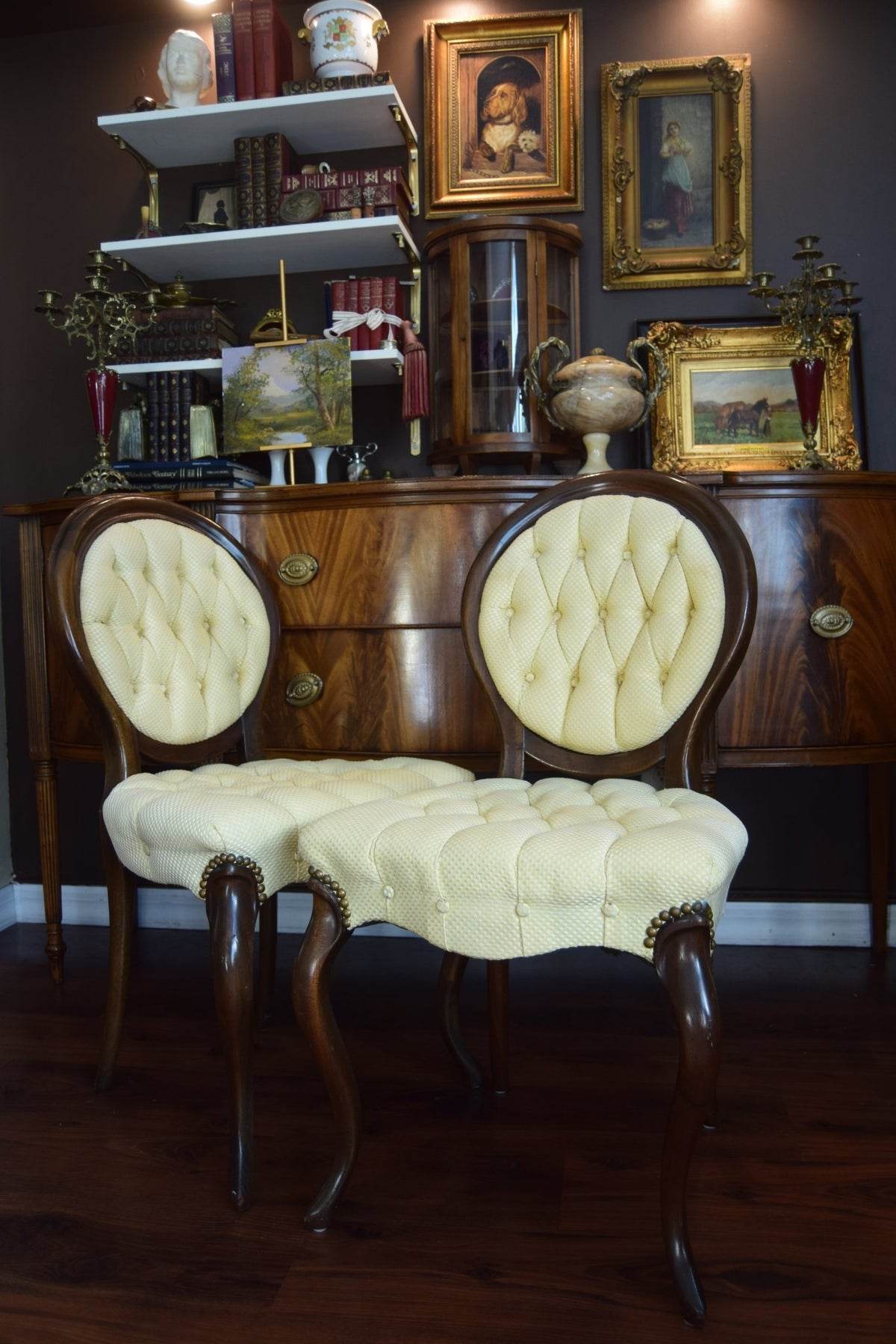 Elegant echoes of the Victorian parlour — this pair of 19th-century side chairs embodies the romanticism and refinement of the era. With their balloon-back frames, deep button-tufted seats, and cabriole legs, they mirror the Rococo revival style that defined mid-1800s England and France. Originally designed for drawing rooms where conversation was an art, pieces like these were symbols of grace and comfort, crafted in walnut and often upholstered in light damask or brocade. Today, they remain among the most timeless silhouettes of antique furniture — delicate yet sculptural, simple yet impossibly elegant. Condition: upholstery is in excellent shape, only in the back of one chair few inches came out of the molding.