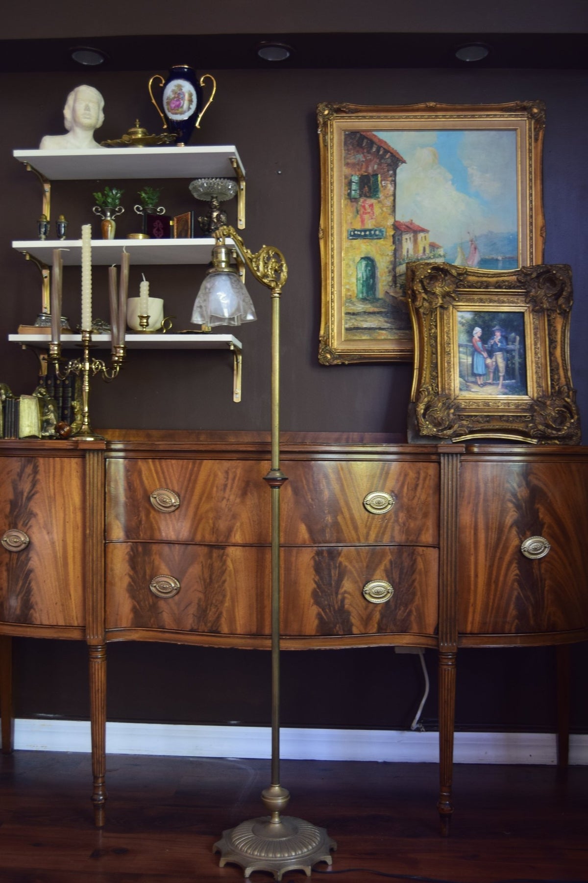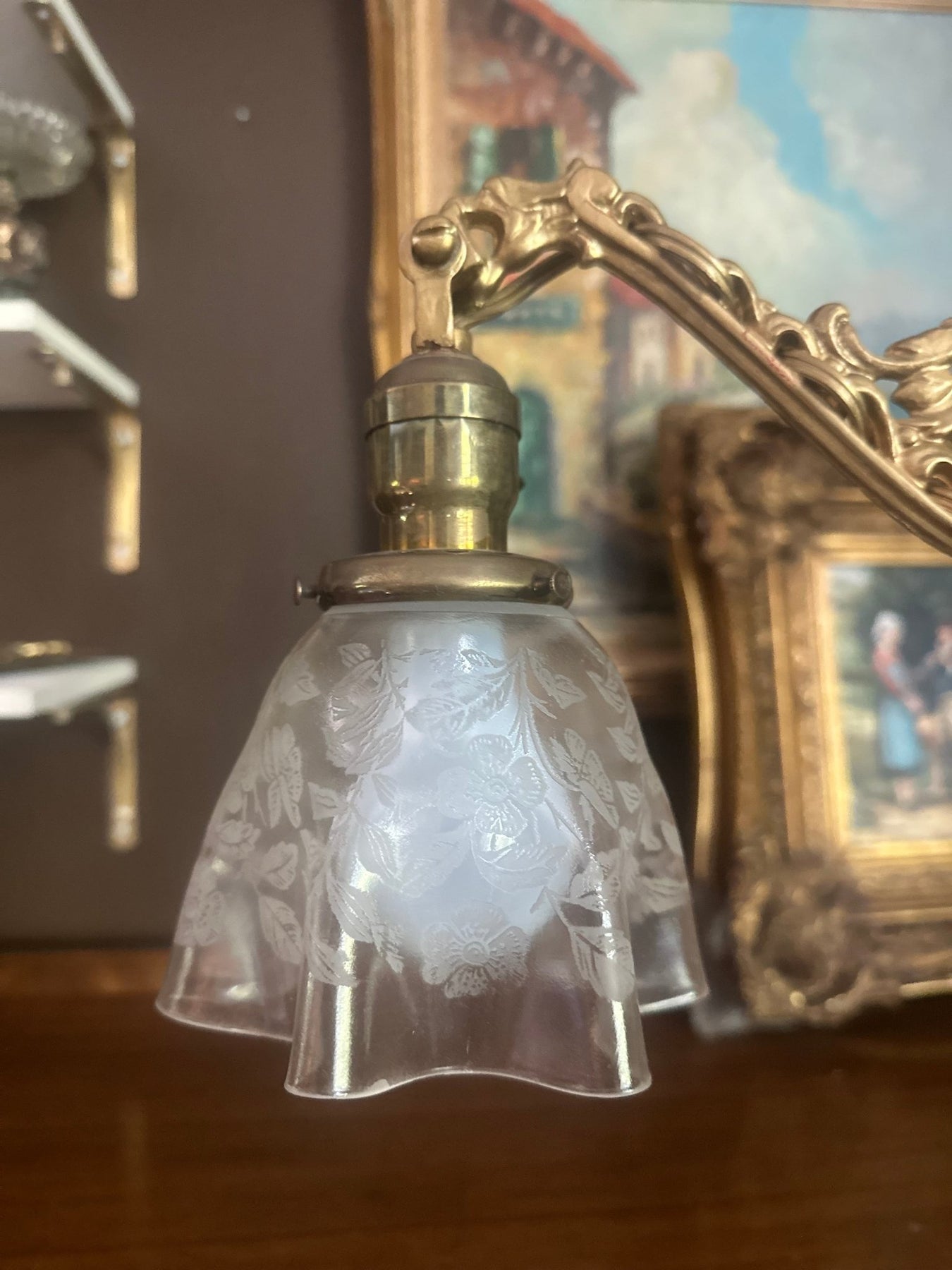 Art Nouveau Brass Floor Lamp with Etched Floral Glass Shade, c. 1930s