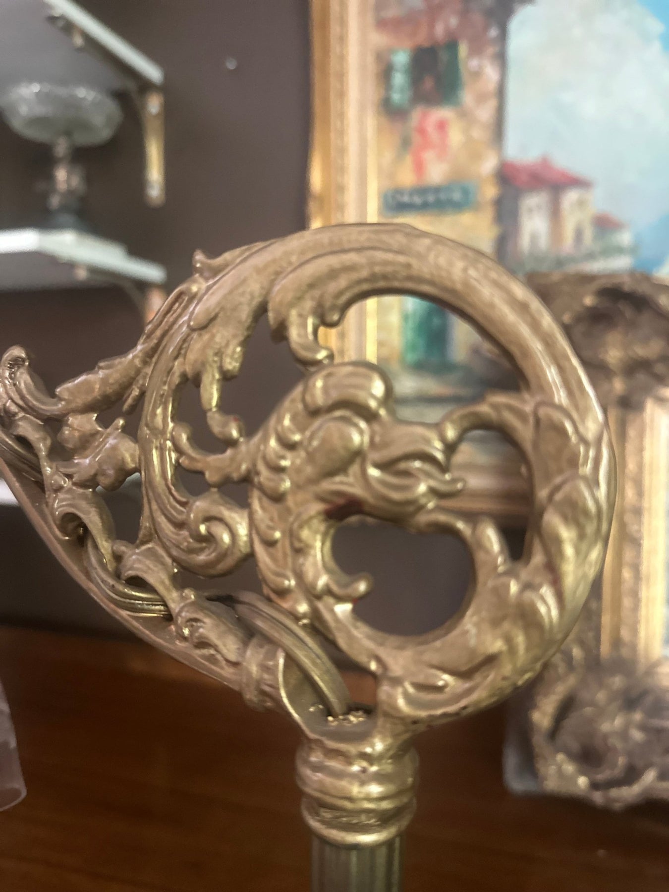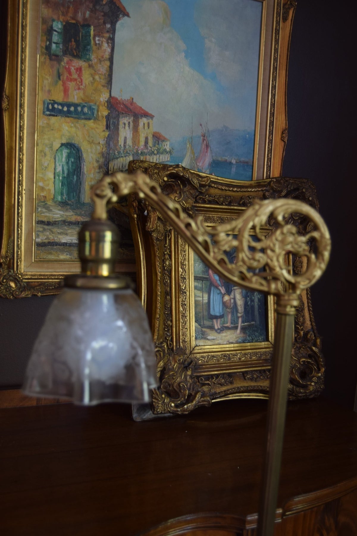 An elegant early 20th-century brass floor lamp with exquisite Art Nouveau detailing and its original frosted glass shade delicately etched with a floral motif. The ornate scrollwork arm captures the organic curves typical of the period, while the fluted column and weighted cast base provide refined balance and stability.