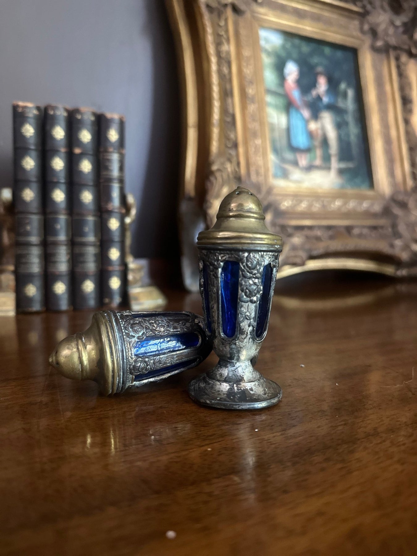 An elegant pair of antique silverplate and cobalt glass shakers, dating to the early 1900s. The deep blue glass inserts glow beautifully through the ornate silver overlay, which features floral and scrollwork motifs. The contrast between the rich cobalt hue and the aged silver finish gives these petite vessels an undeniable charm.