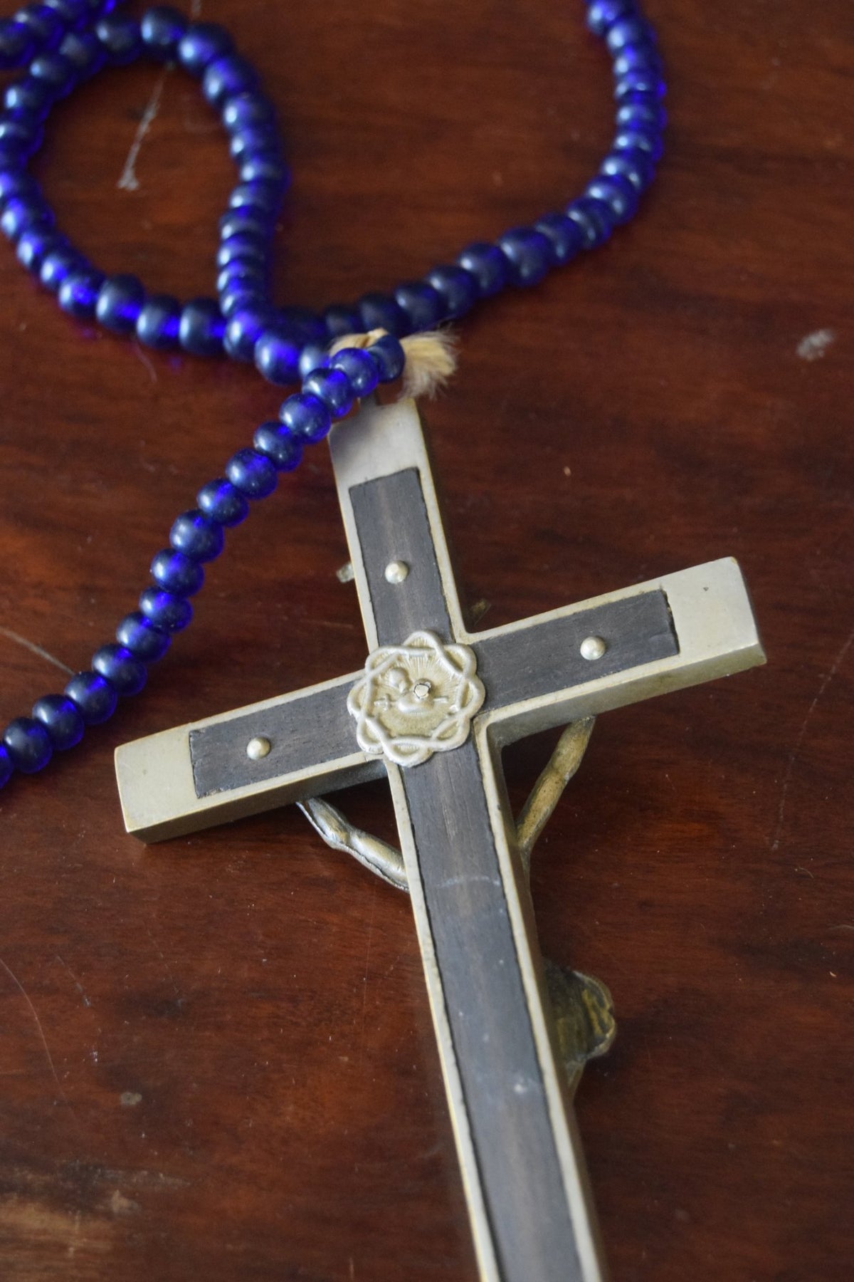The blue glass beads signify Marian devotion — blue being traditionally associated with the Virgin Mary and purity of faith.