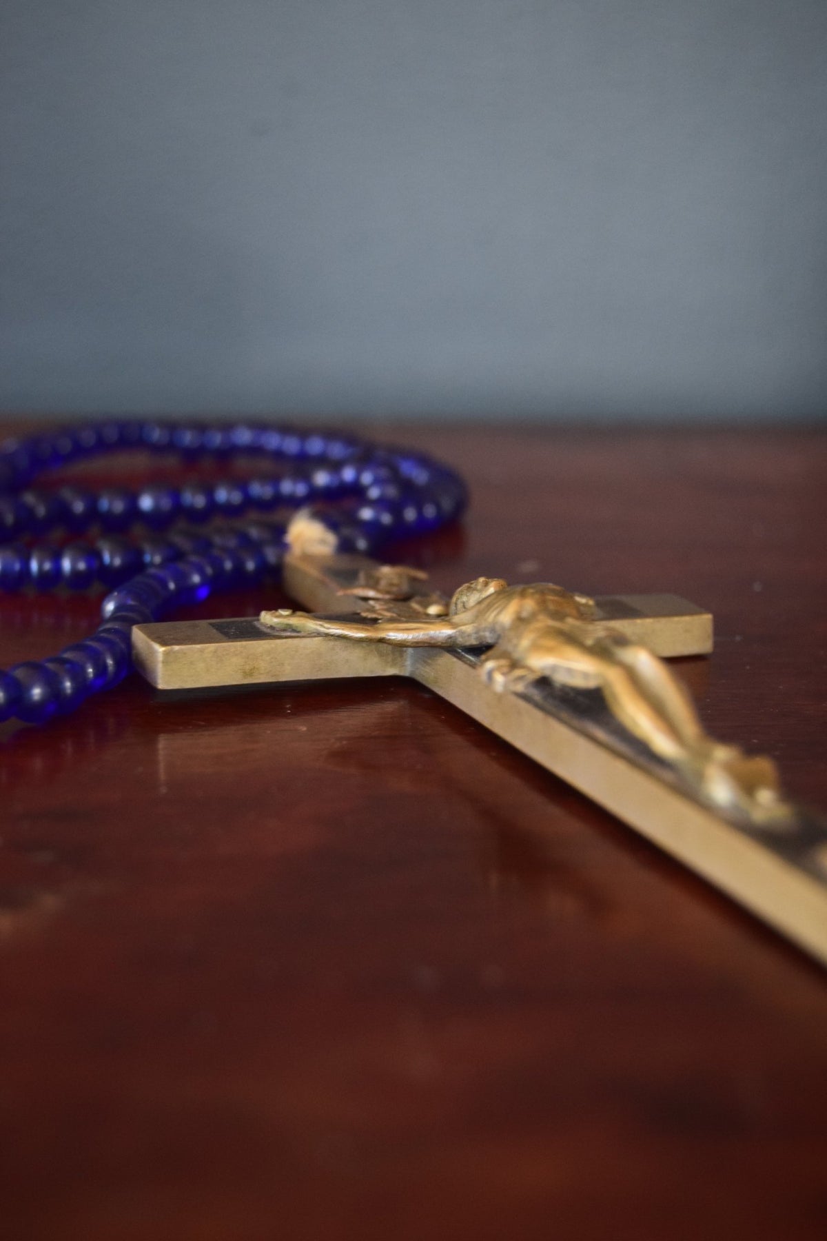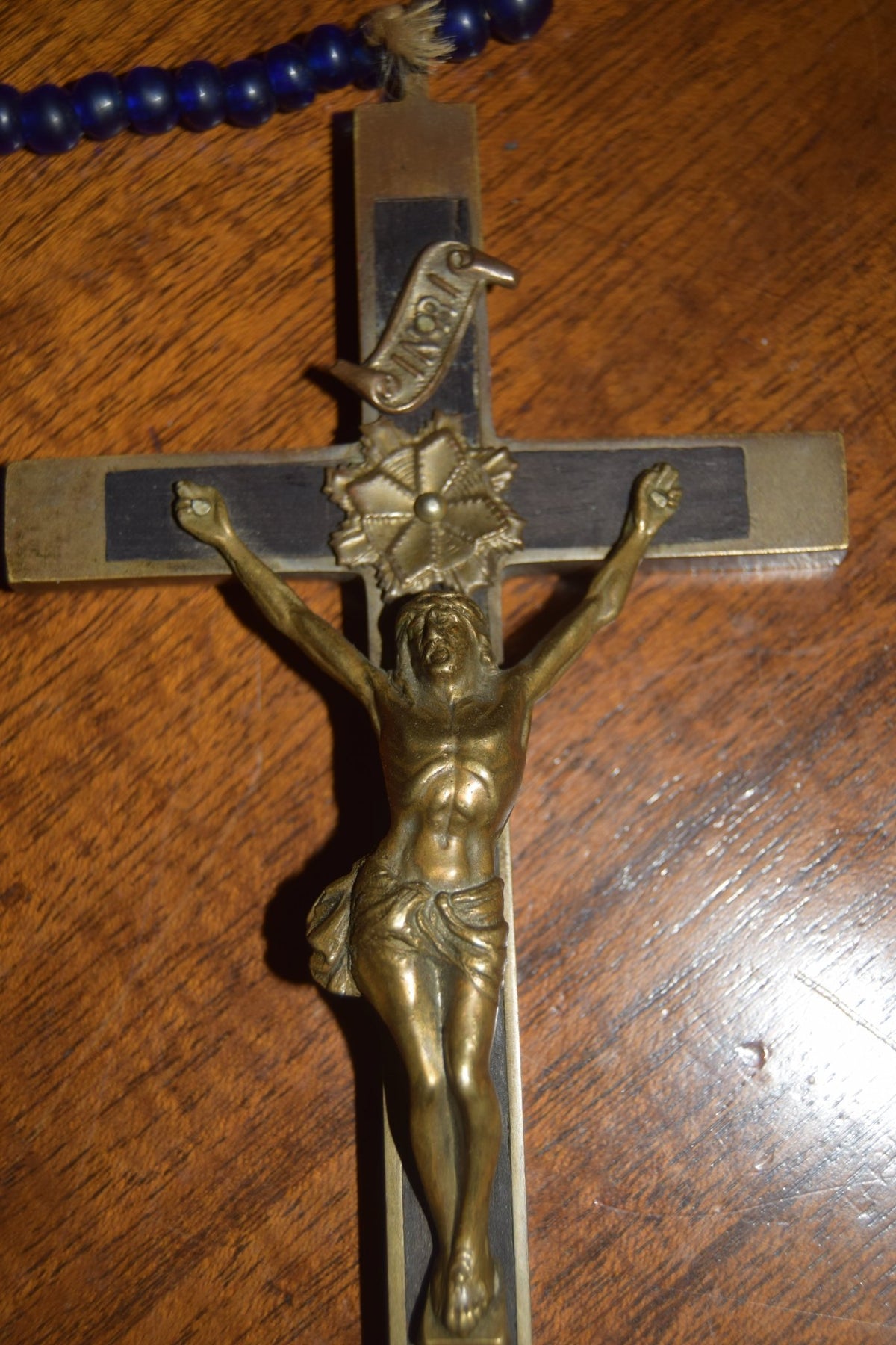 Late 19th-century French brass and ebony-inlaid rosary crucifix, most likely a missionary or priest’s crucifix, dating from circa 1880.