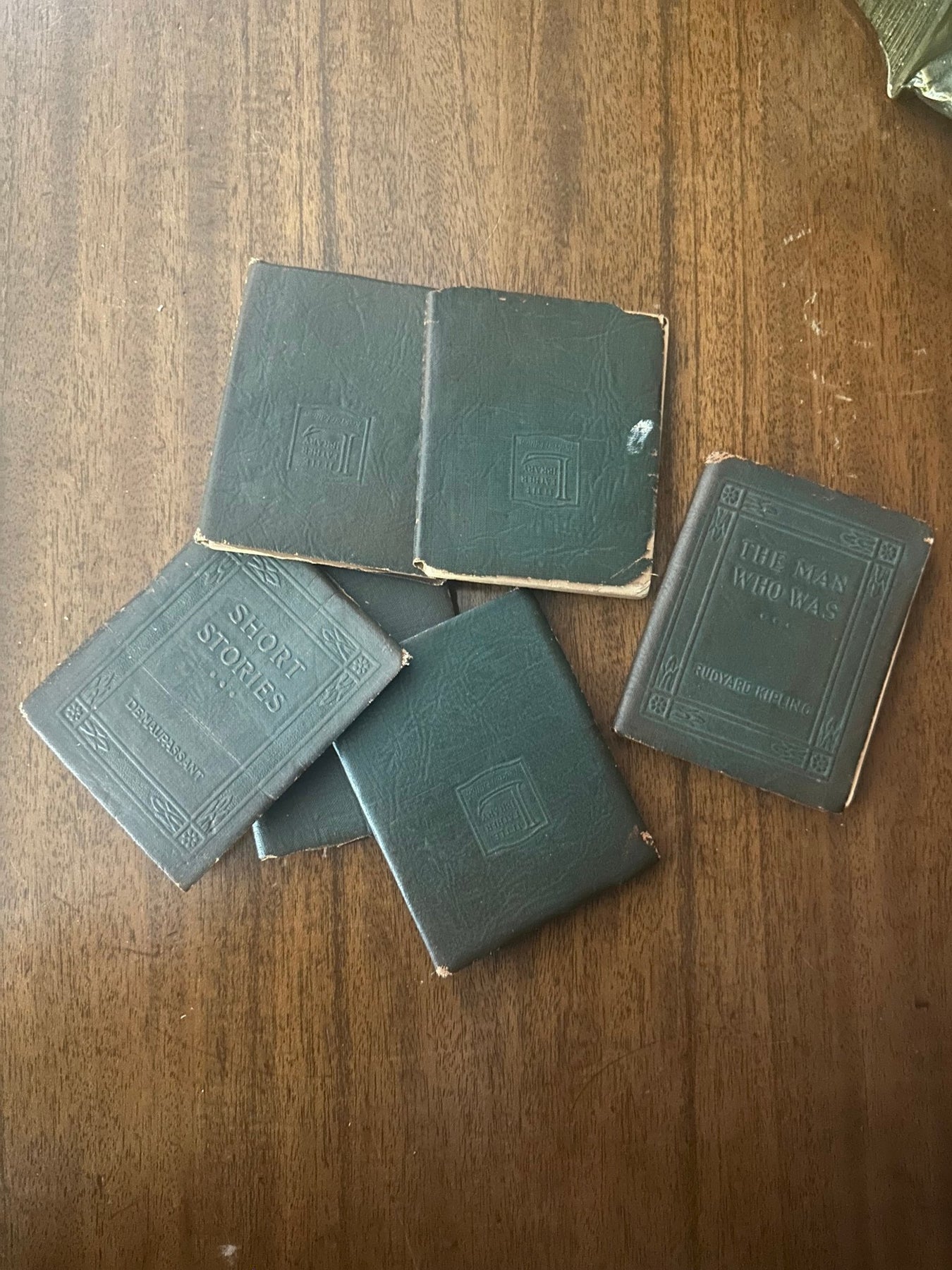 The set includes titles such as The Man Who Was and Short Stories, each filled with the literary elegance of their era. Their petite size and worn edges tell a story of time and handling—beloved pieces that have crossed more than a century.